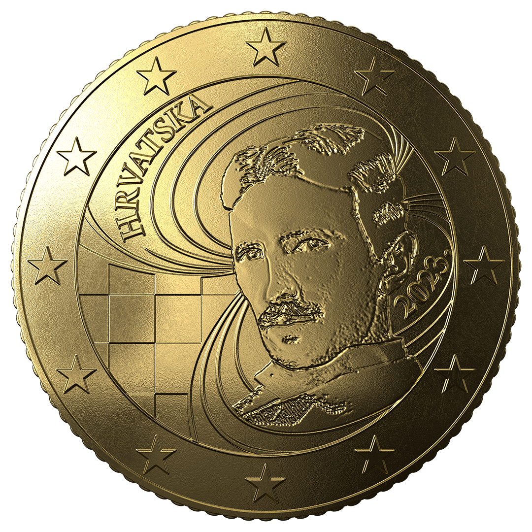 Nacionalna strana: Motiv prikazuje portret slavnog znanstvenika Nikole Tesle. Oko portreta nalazi se grafički prikaz elektromagnetskih silnica. U donjem lijevom segmentu kovanice nalazi se šahovnica. U gornjem lijevom segmentu kovanice između dvije silnice vidljiv je natpis HRVATSKA.