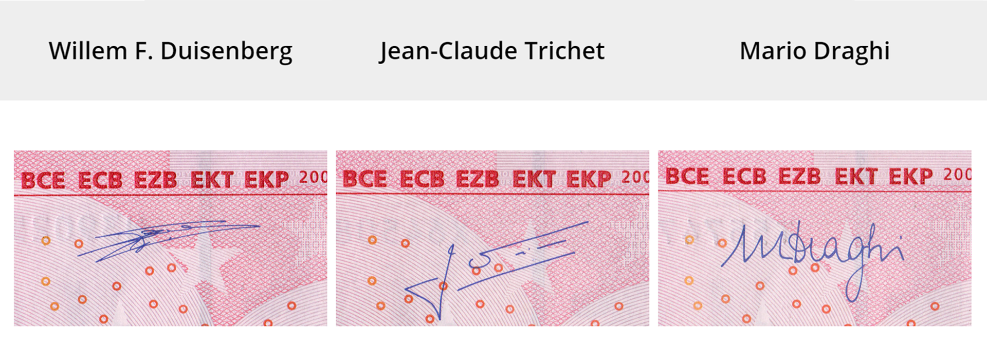 Na licu svake euronovčanice prve serije potpis je jednog od bivših predsjednika Europske središnje banke Willema F. Duisenberga (prvog), Jean-Claudea Tricheta (drugog) ili Marija Draghija (trećeg). Potpis se nalazi ispod pokrata naziva Europske središnje banke.