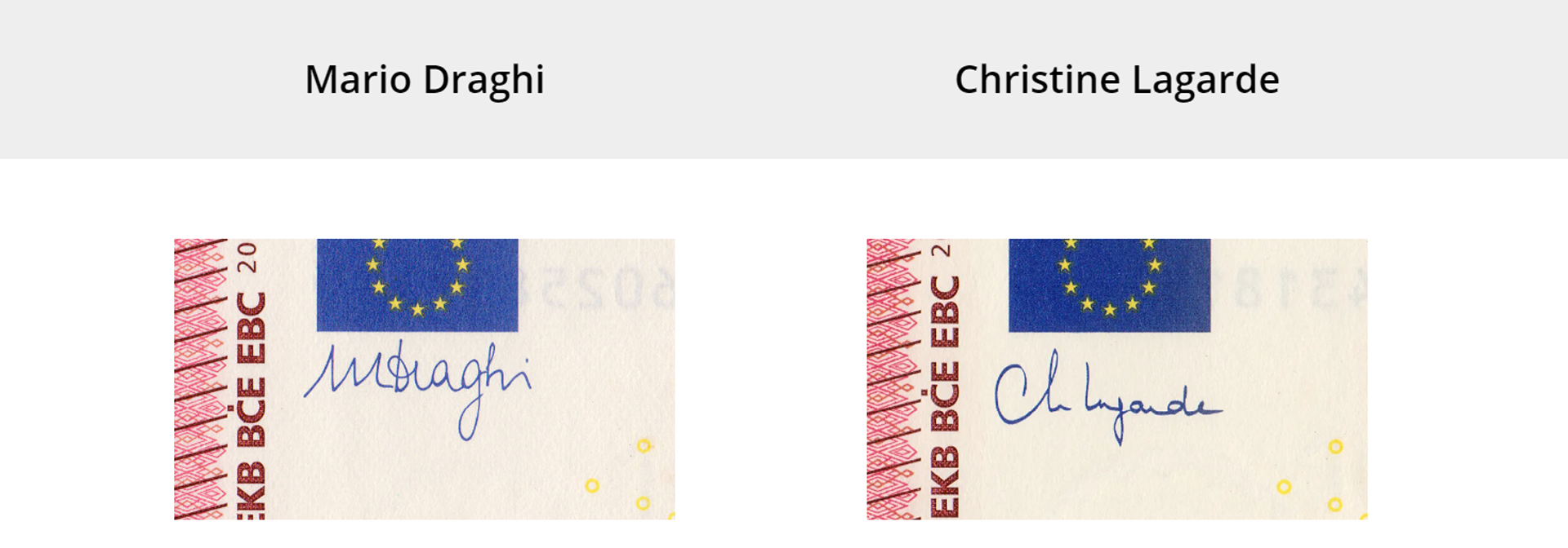 Na licu svake euronovčanice serije Europa potpis je četvrtog predsjednika Europske središnje banke Marija Draghija ili sadašnje predsjednice Christine Lagarde. Potpis se nalazi ispod motiva zastave Europske unije. Sve su novčanice važeće bez obzira na to čiji potpis je implementiran u njihov dizajn.